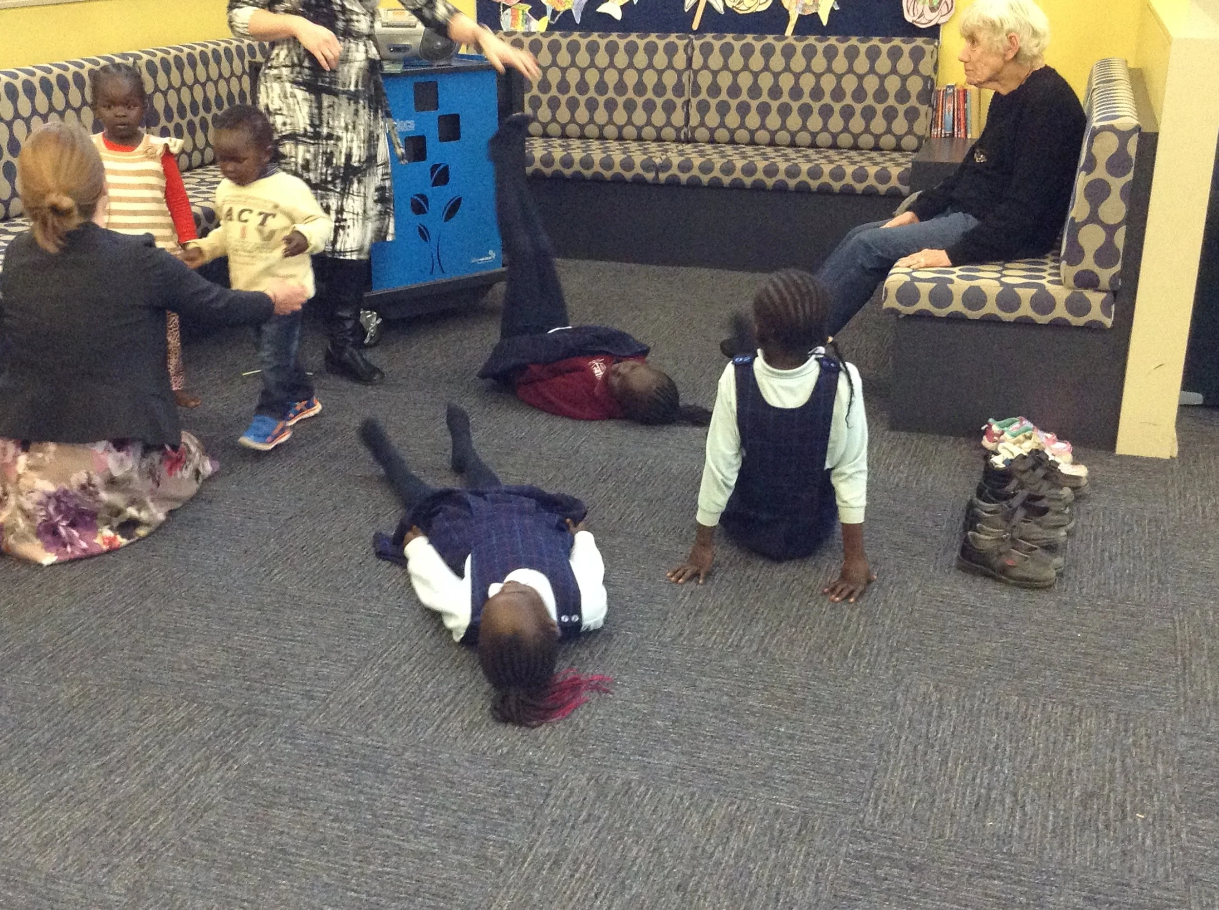 Our focus for weeks 3 and 4 of our pilot program have been about building literacy skills for our families to use at home. We decided to divide the various age groups to cater for their differing needs. For our littlest ones we organised a librarian to come and do a “wiggle and giggle” session focussing on oral language development through song and rhyme. This was followed by a story book or two. Leilah and Pat wiggled and giggled along and ensured even the littlest members had a good time.